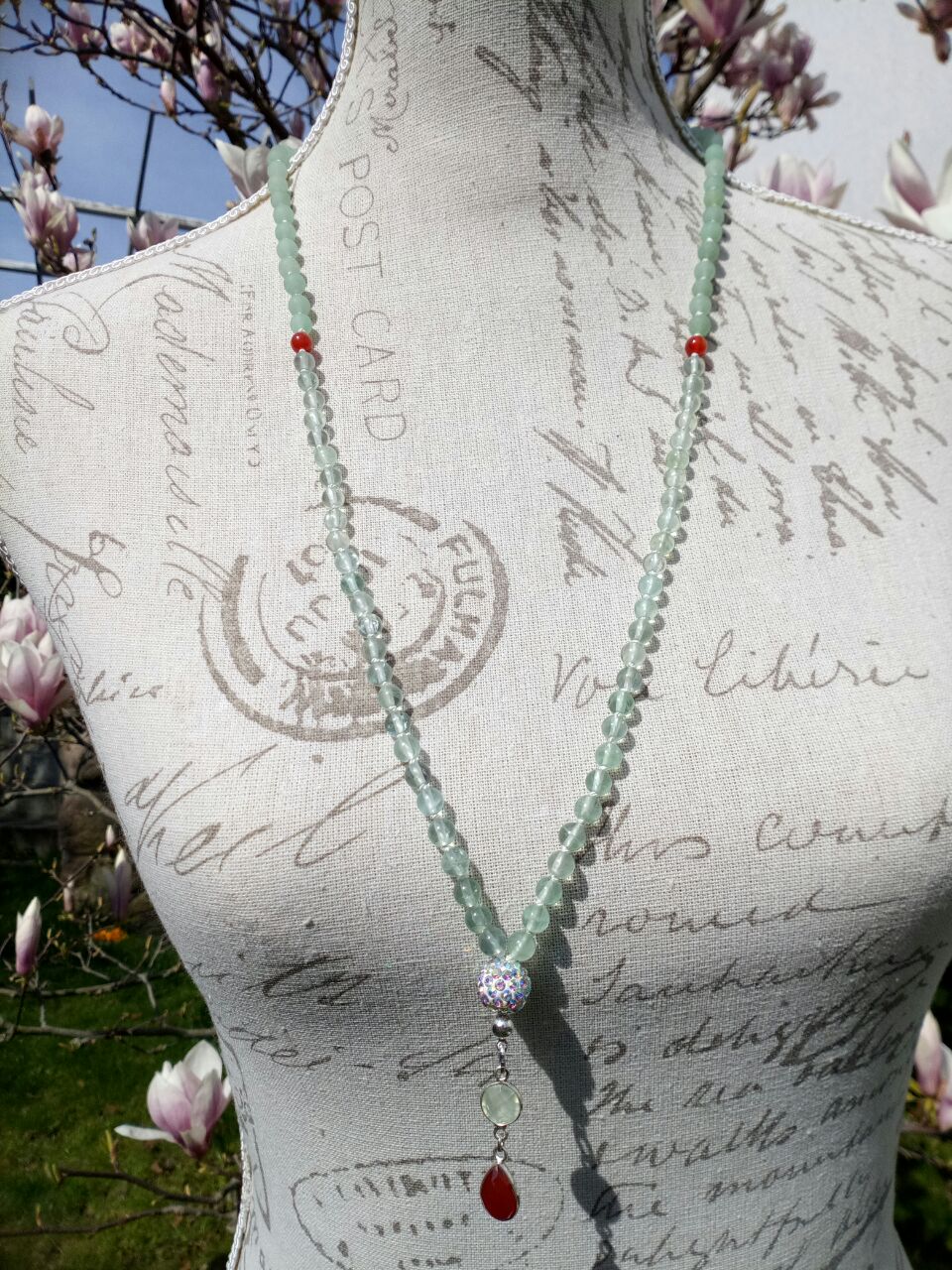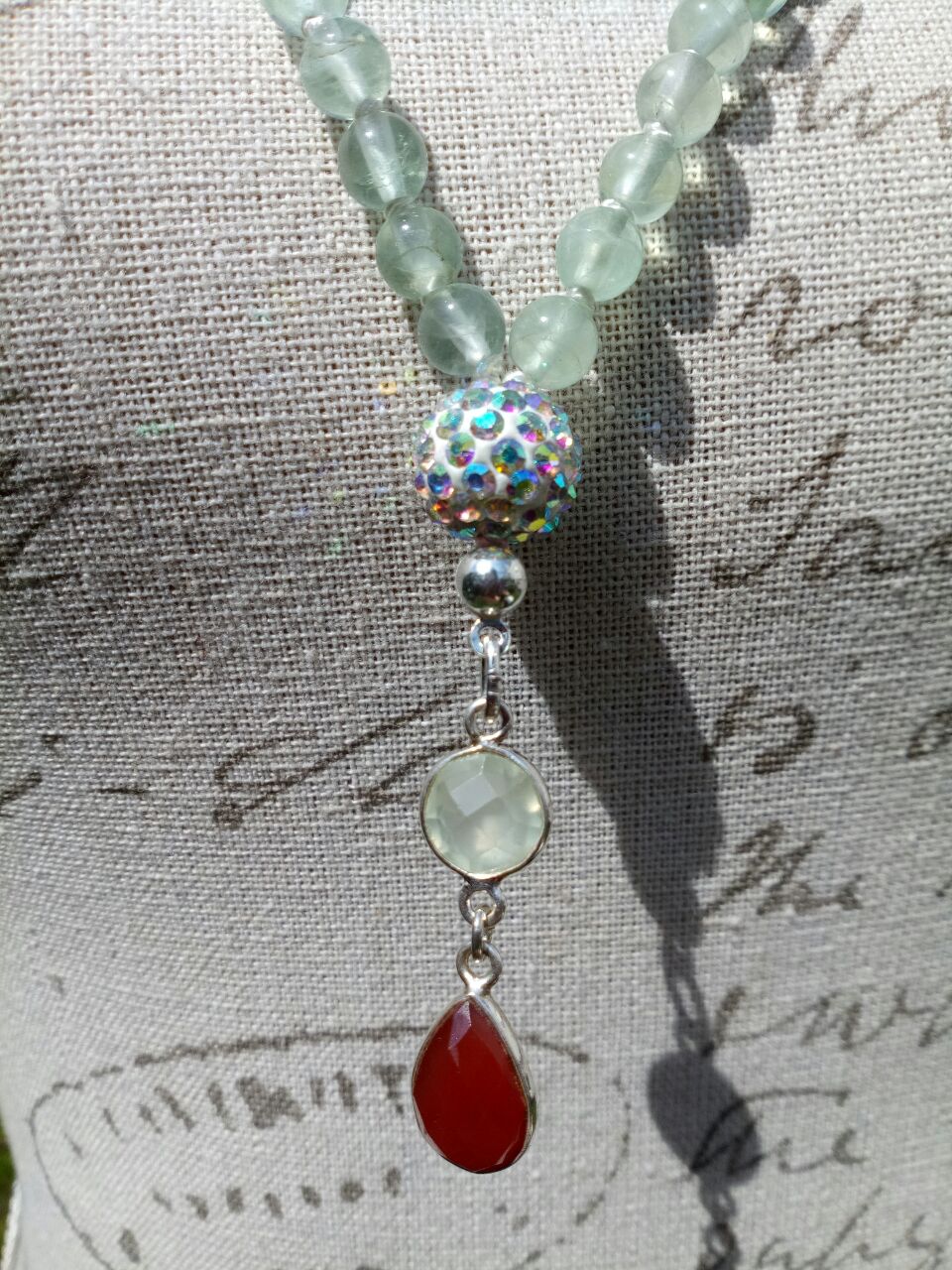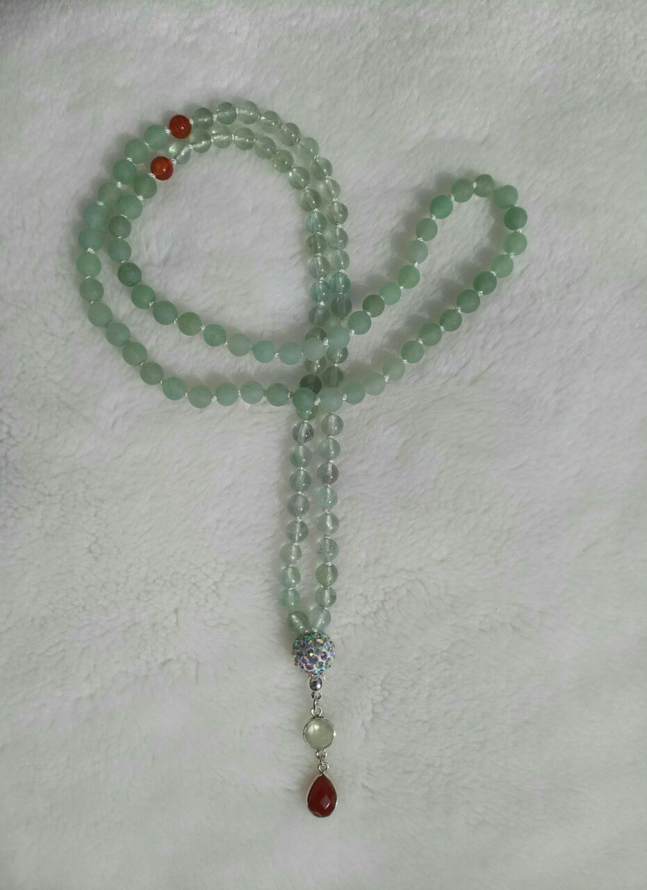 Grüne Jade und grüner Fluorit, Zwischenperlen Karneol, Guruperle facettierte Kristalle in Kunststoff, Kalotte und Biegering; 925er Sterlingsilber, Anhänger Karneol und Jade, gefasst in 925er Sterlingsilber.