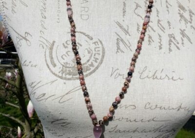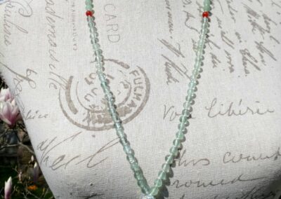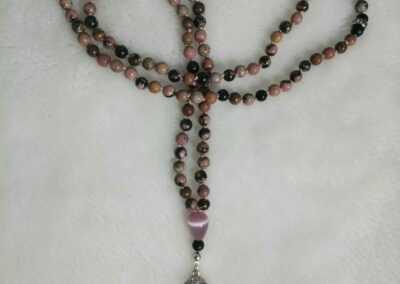Nun kamen Menschen mit der Bitte auf mich zu, ihnen eine persönliche Mala anzufertigen. So floss ins Schmuckdesign immer mehr mein mediales und energetisches Wirken ein. Es entstand Schmuck, wie ich ihn mir gewünscht hatte. Im Design vereinen sich nun der spirituelle Hintergrund der klassischen Mala, meine Fähigkeiten als Künstlerin, Medium und Energetikerin sowie die vielfältigen Eigenschaften von Kristallen und Metallen.