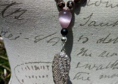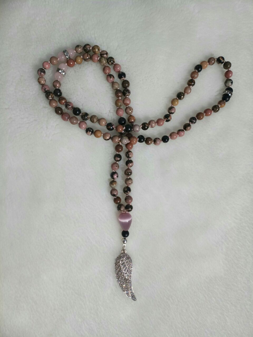 Rhodonit, Rosenquarz und Onyx, Zwischenringe Metall mit Glassteinen, Guruperle Glas und Onyx, Kalotte und Biegering 925er Sterlingsilber, Anhänger Engelflügel 925er Sterlingsilber mit Zirkonia.