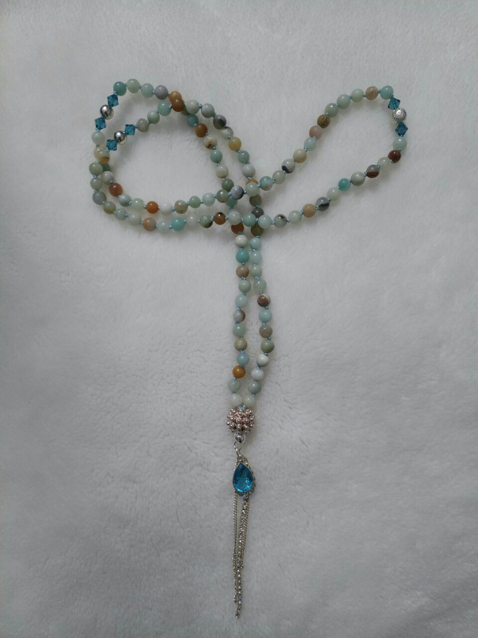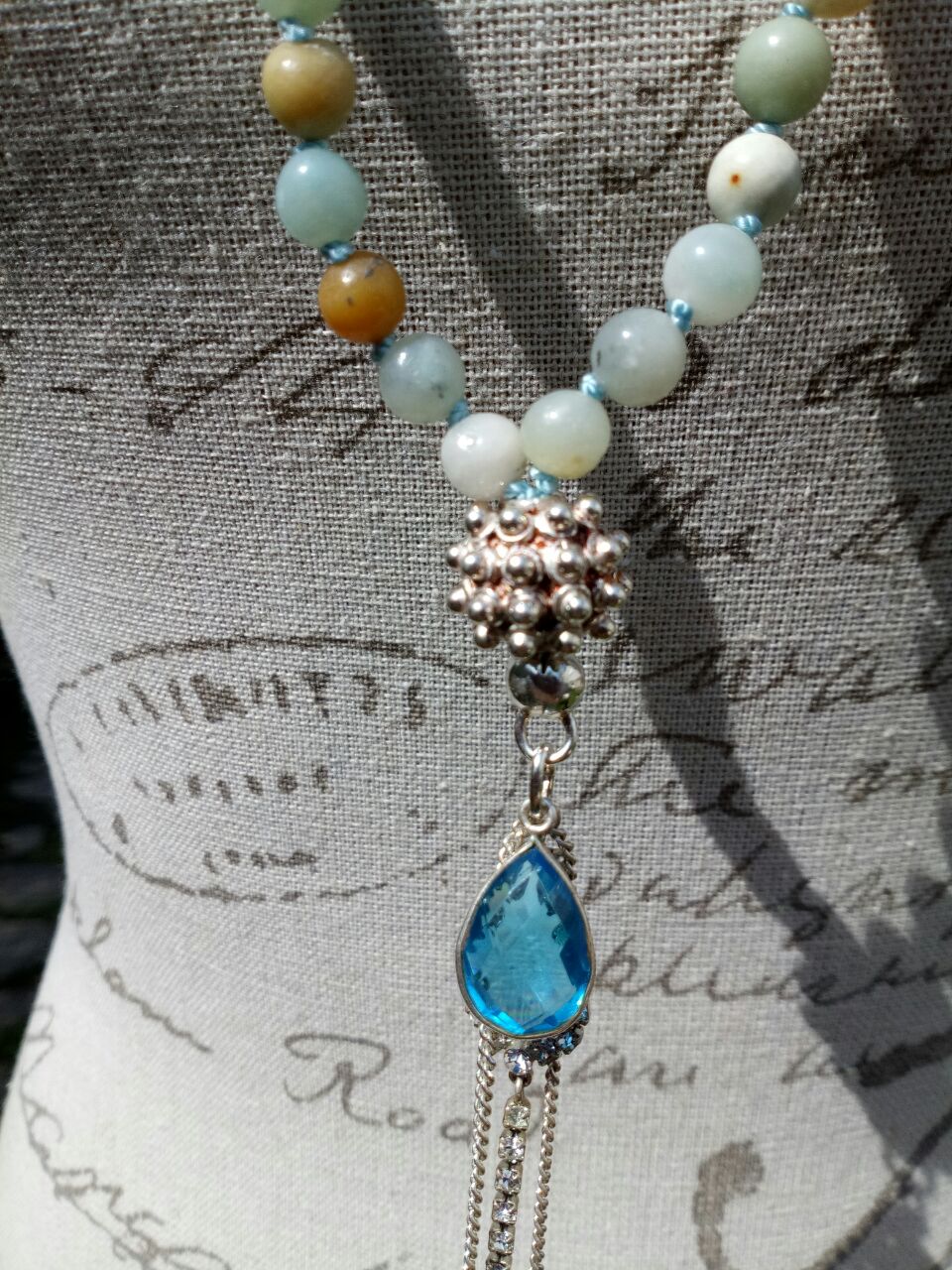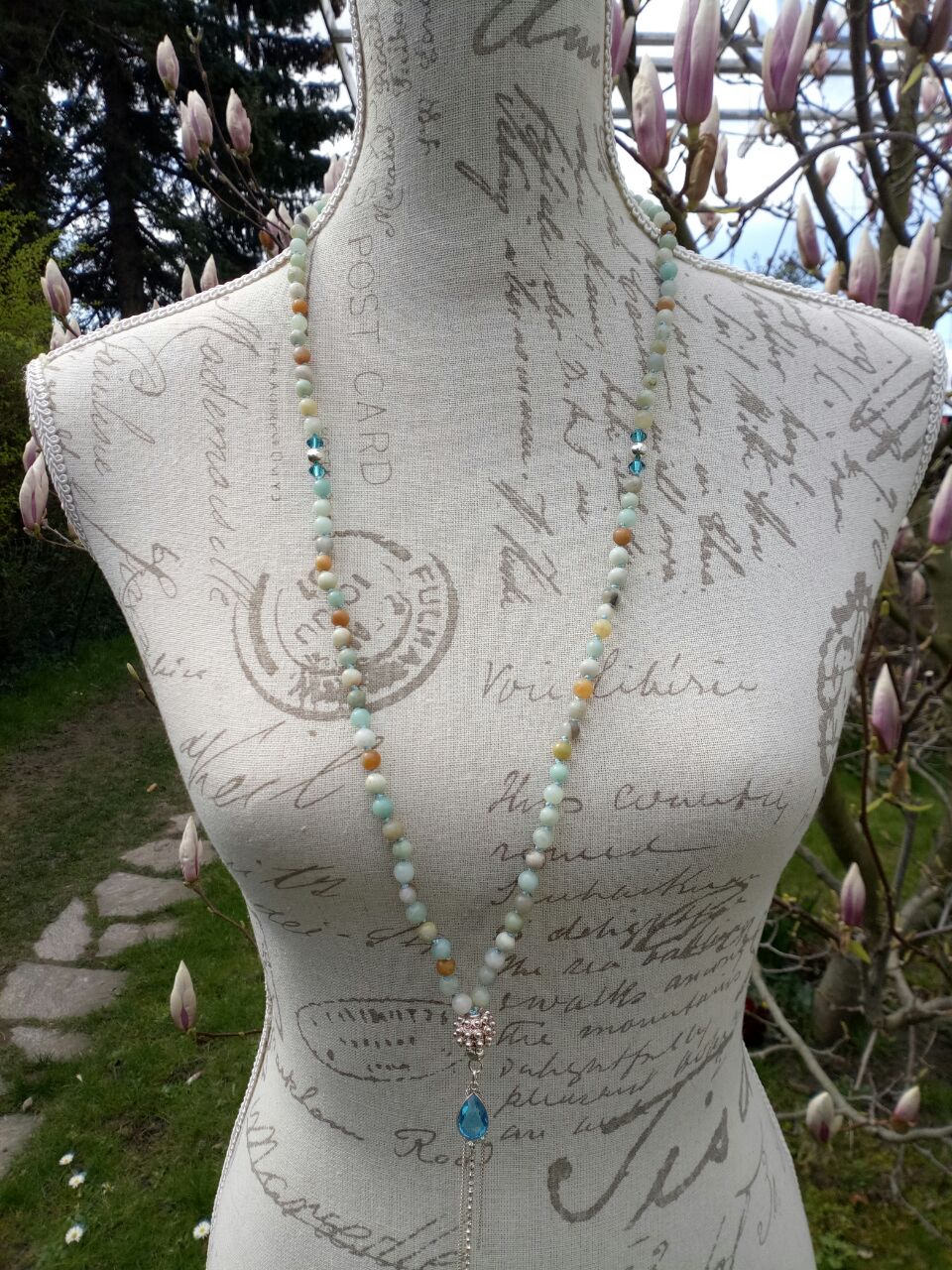 Amazonit, Zwischenperlen Swarovskikristalle und 925er Sterlingsilberperlen; Guruperle 925er Sterlingsilber; Kalotte und Biegering 925er Sterlingsilber; Anhänger Glas und Metall.