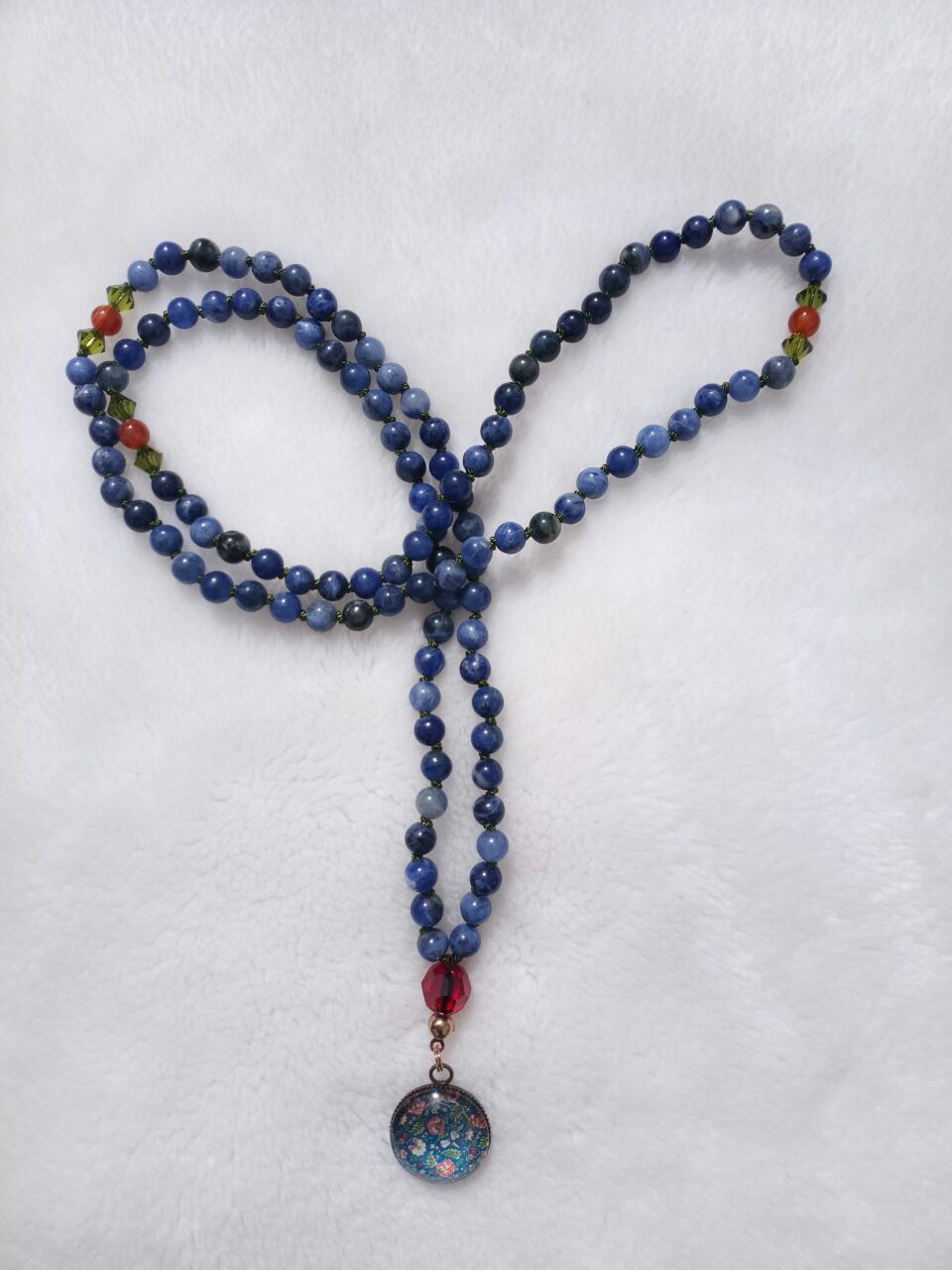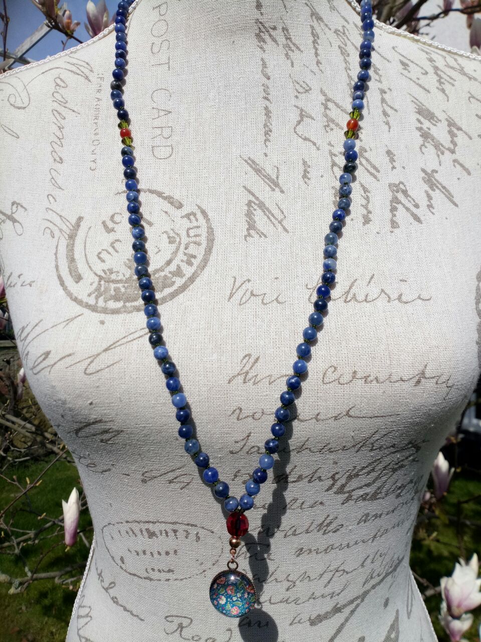 Sodalith, Zwischenperlen Karneol und Swarovskikristalle, Guruperle Glas, Kalotte und Biegering; 925er Sterlingsilber; rosévergoldet, Anhänger Blumencabochon mit Metall.