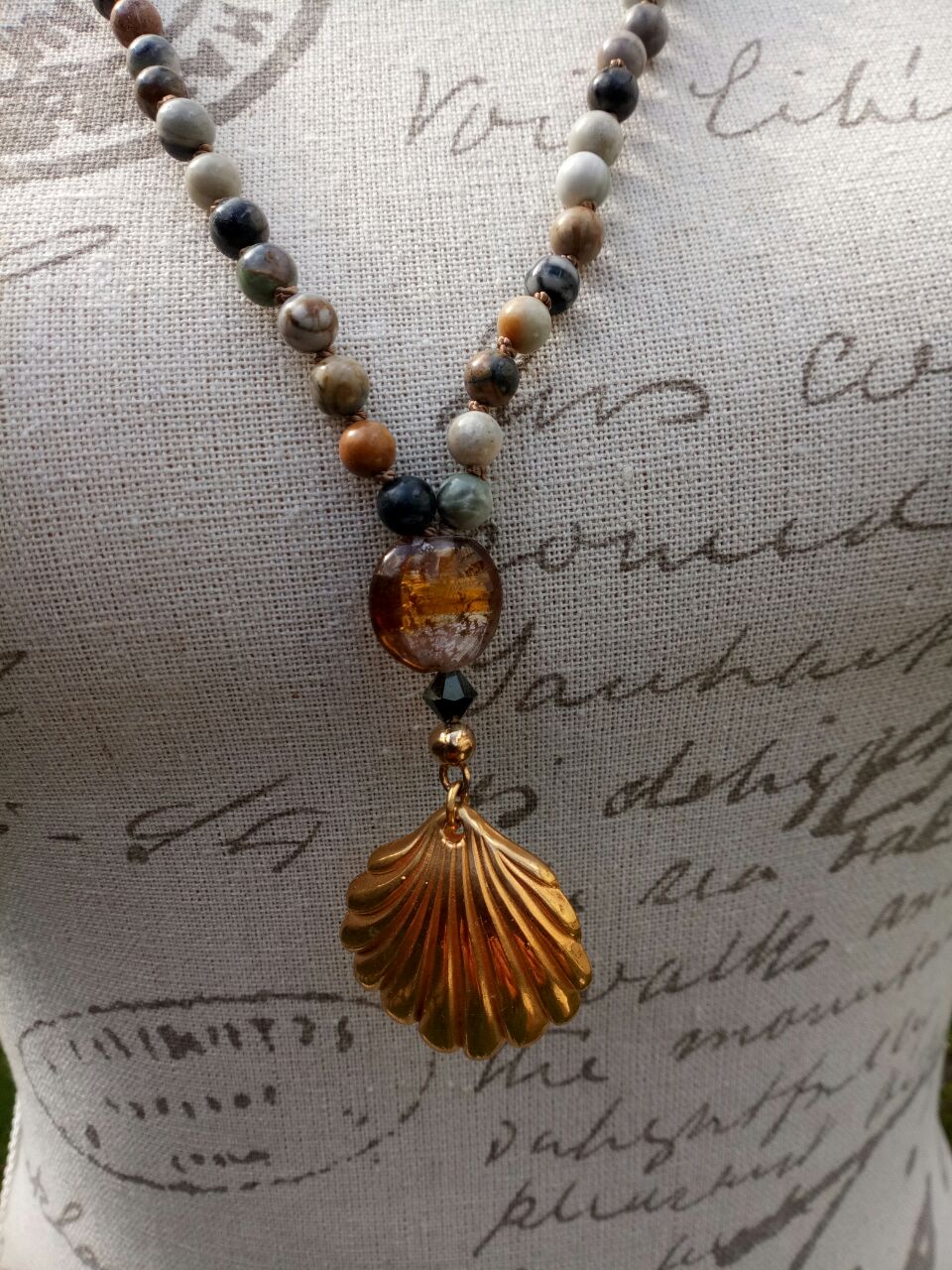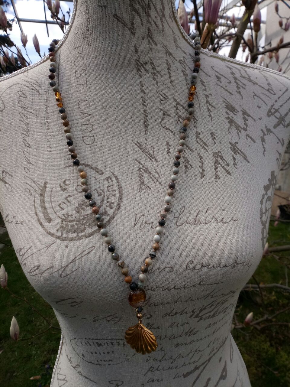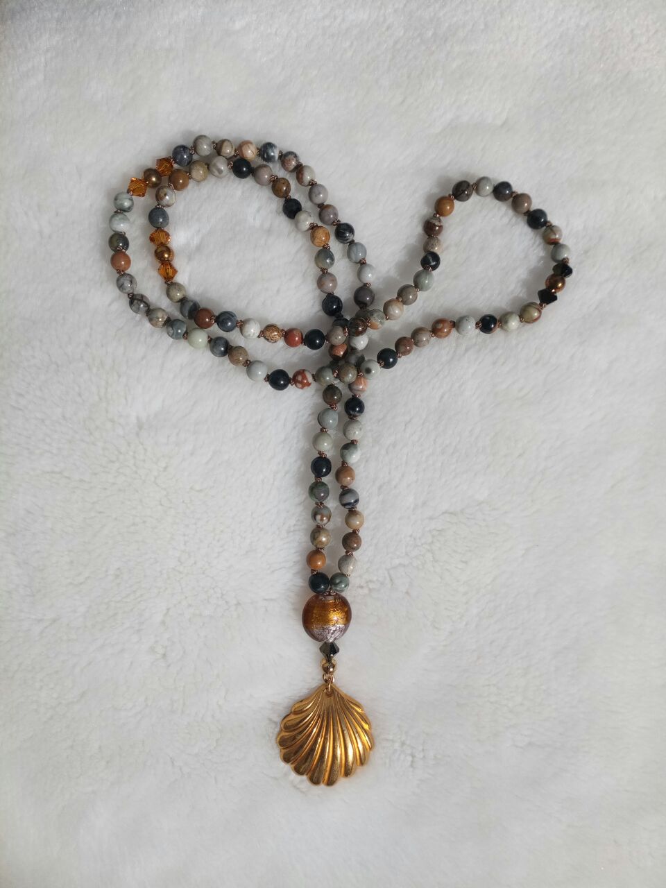 Picasso-Marmor und Swarovskikristalle, Zwischenperlen 925er Sterlingsilber; vergoldet, Guruperle Glas, Kalotte und Biegering 925er Sterlingsilber; vergoldet, Anhänger Muschel Messing.