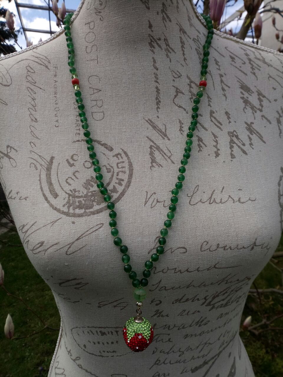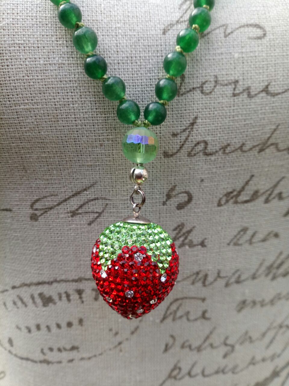 Jade und Swarovskikristalle, Zwischenperlen Keramik, Guruperle Glas, Kalotte und Biegering, 925er Sterlingsilber, Anhänger Erdbeere Strass und 925er Sterlingsilber.