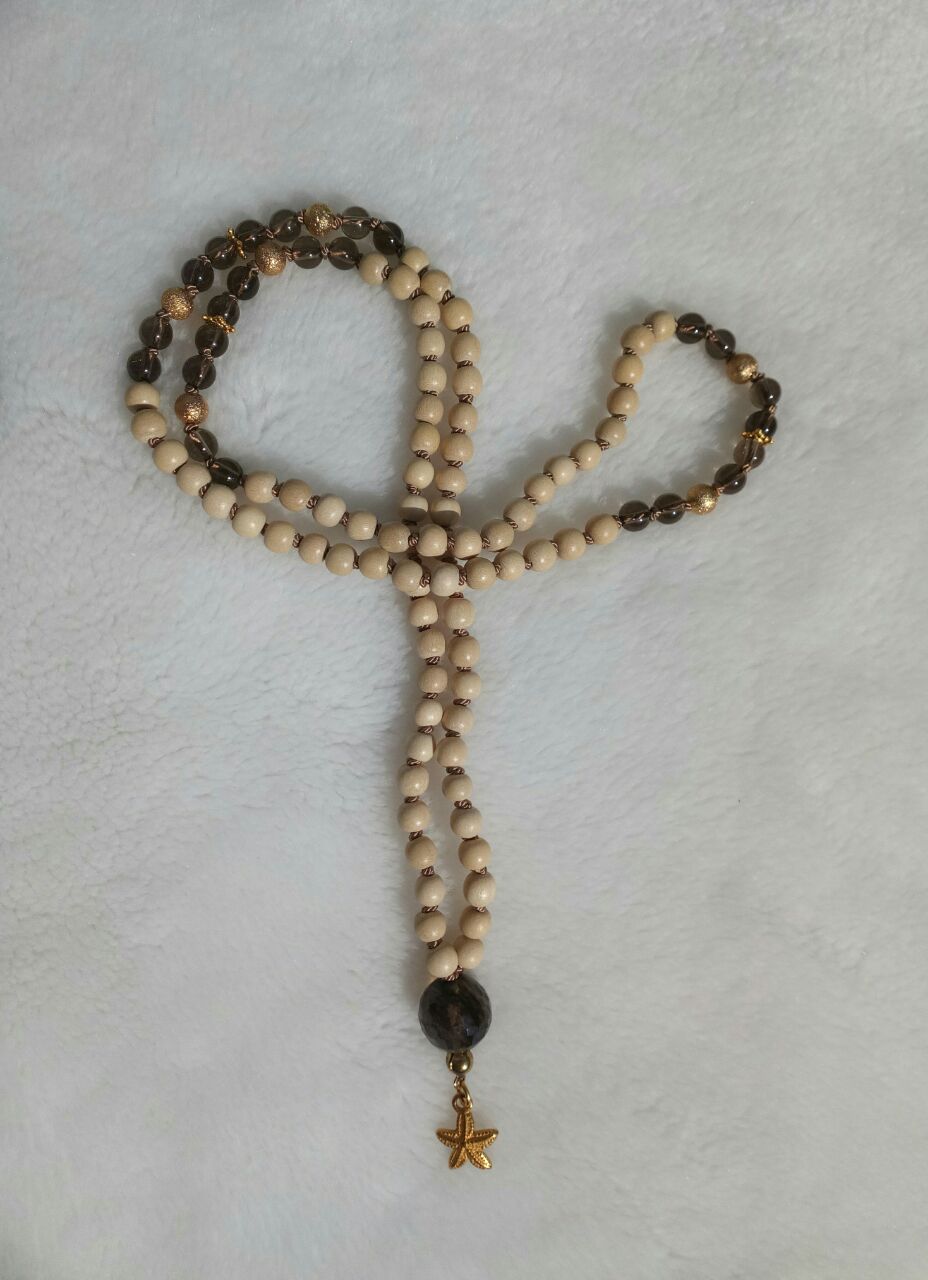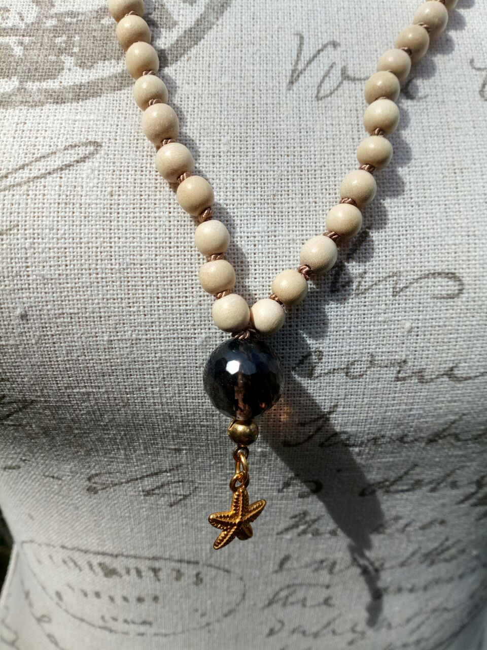 Holz, Rauchquarz, Messing; vergoldet und Distanzscheiben; Metall, Guruperle Rauchquarz, Kalotte und Biegering, 925er Sterlingsilber; vergoldet, Anhänger Seestern Metall.
